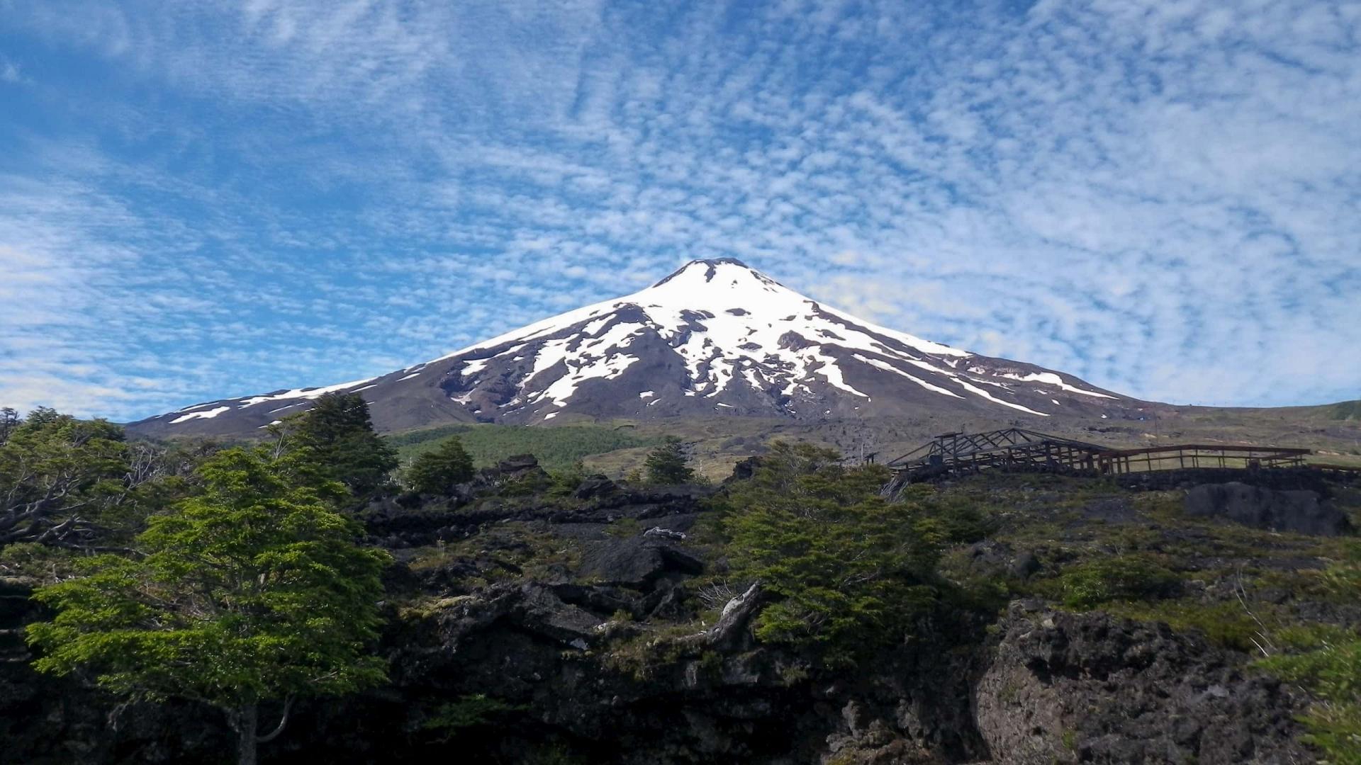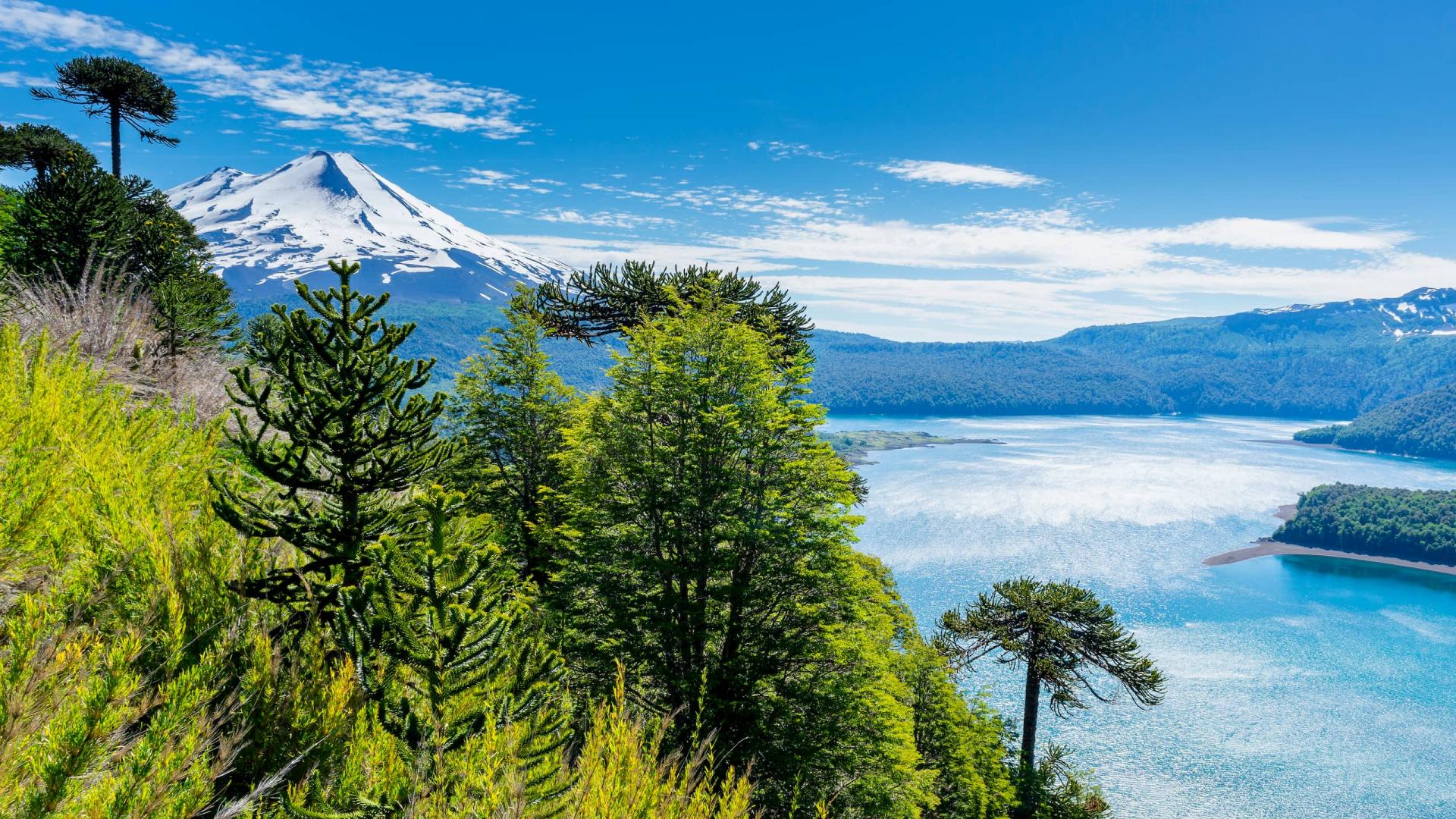 Parque Nacional Conguillio en la Región de la Araucanía con la vista al volcán activo Llaima.