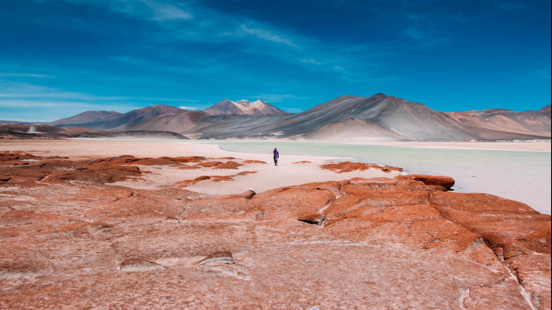 Piedras rojas, salar y lagunas del desierto de Atacama alrededor de San Pedro. Reserva Nacional de Los Flamencos.