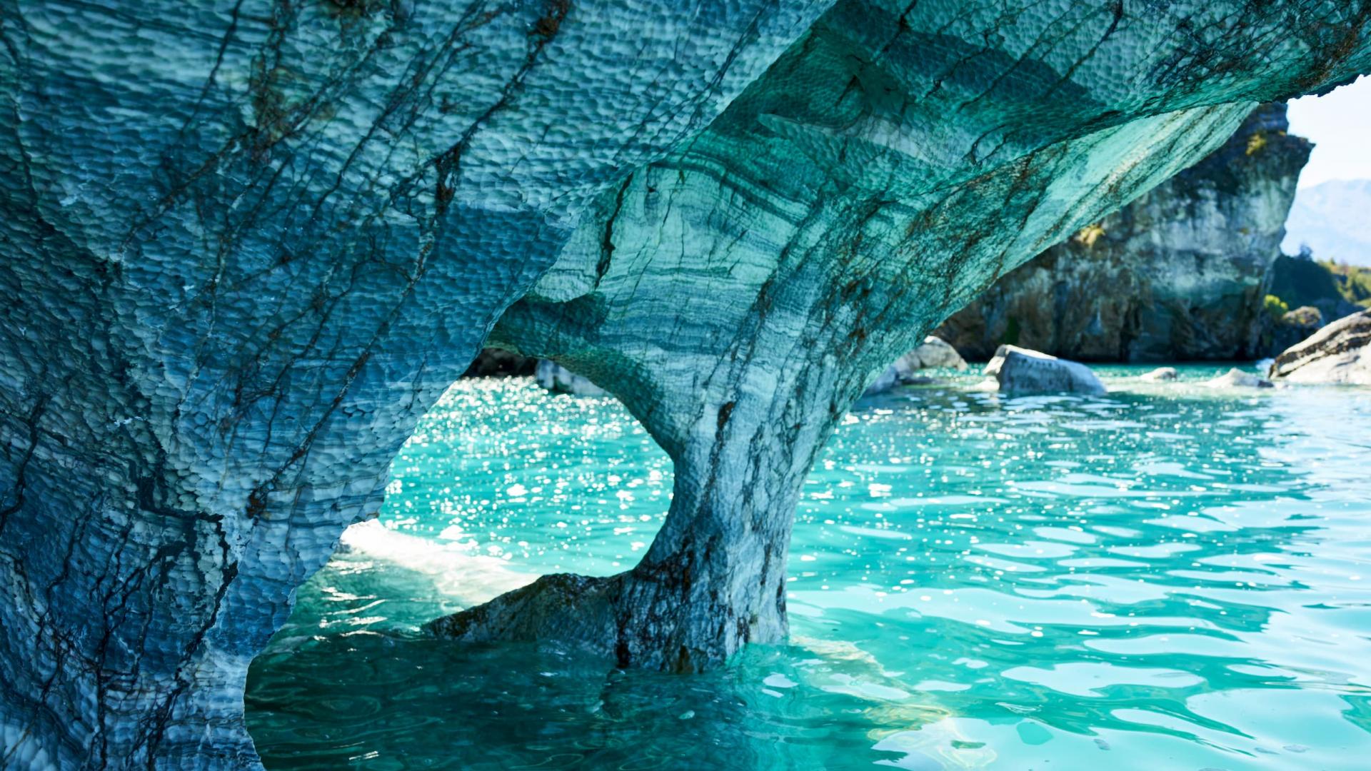 Las cuevas de color gris azulado en el lago glaciar General Carrera.