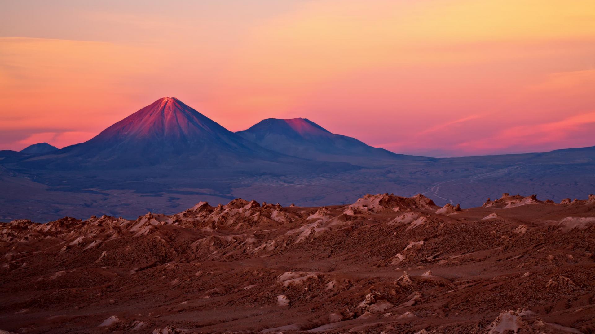 Atardecer en los volcanes Licancábur y Juriques. La vista del valle de la Luna de Atacama.